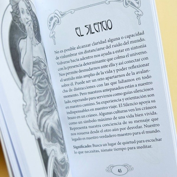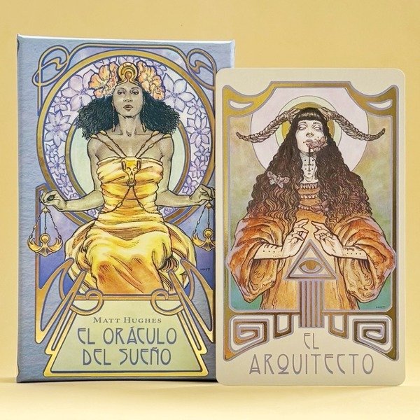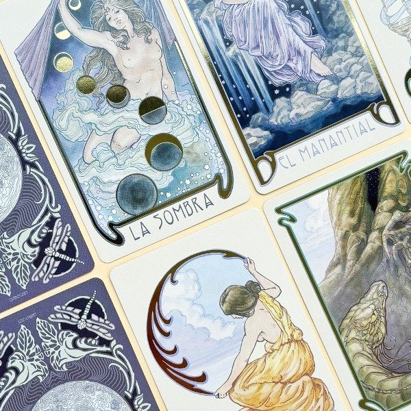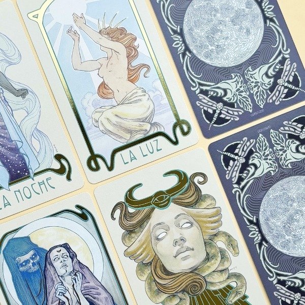 Inspirado en el movimiento Art Nouveau, el diseño de cada carta resalta en detalles dorados, añadiendo un toque de elegancia y originalidad.