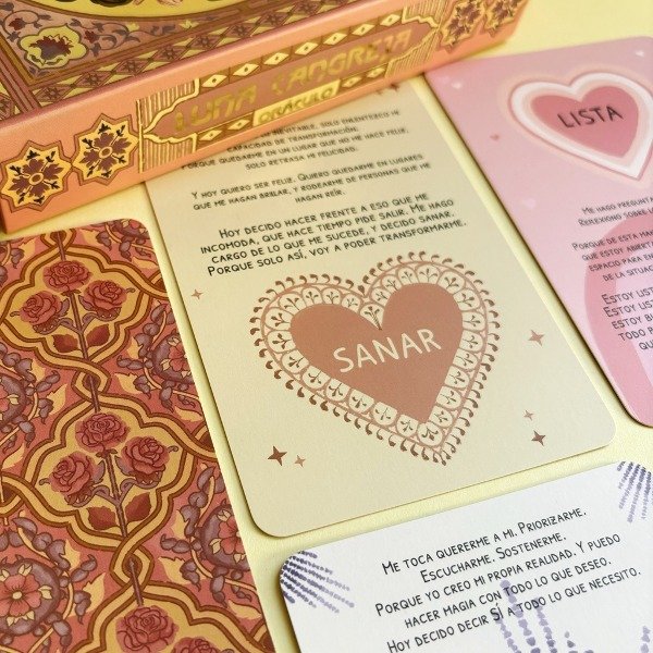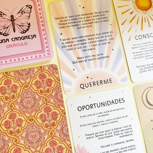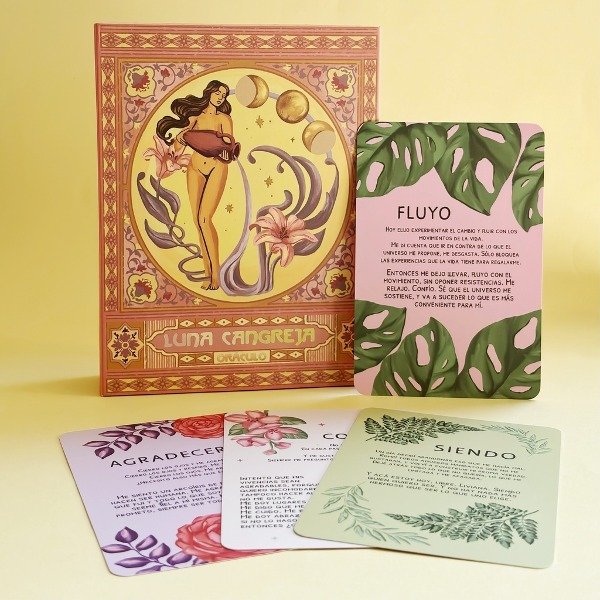 El Oráculo Luna Cangreja está compuesto por un mazo de 44 cartas, cada una con mensajes diseñados para fomentar la reflexión interna, la autoescucha y el autoconocimiento. Estas cartas están concebidas para acompañar y facilitar el proceso de transformación personal.