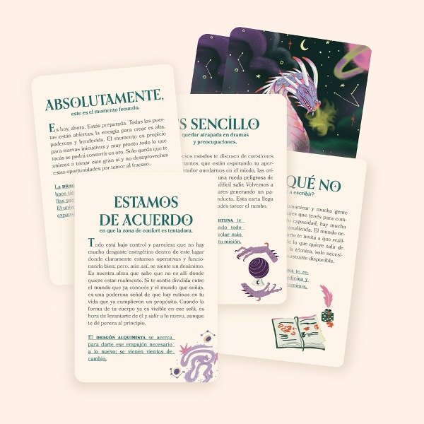 Contiene 44 cartas con mensajes sagrados que provienen de la sabiduría ancestral. Figuras como la dragona de los mares, el dragón de Oriente y el dragón Violeta de la transmutación revelan consejos contundentes, ¿Estás lista para enfrentar los desafíos venideros con la fuerza del dragón?